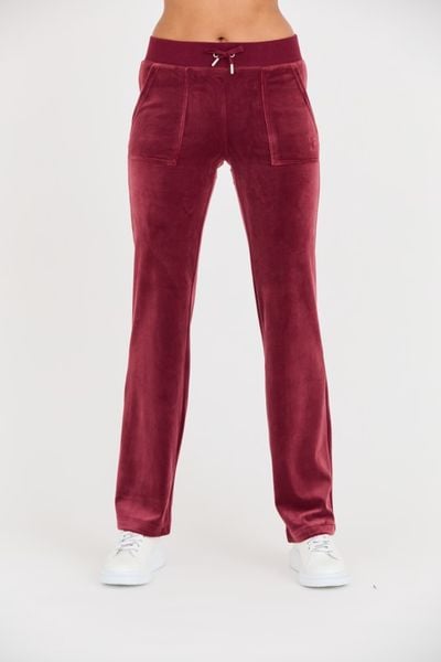 Bordowe damskie spodnie dresowe Del Ray Pocket Pant, JUICY COUTURE. Wymiary modelki: wzrost 176 cm, biust 85 cm, talia 65 cm, biodra 92 cm. Modelka ma na sobie produkt w rozmiarze S.