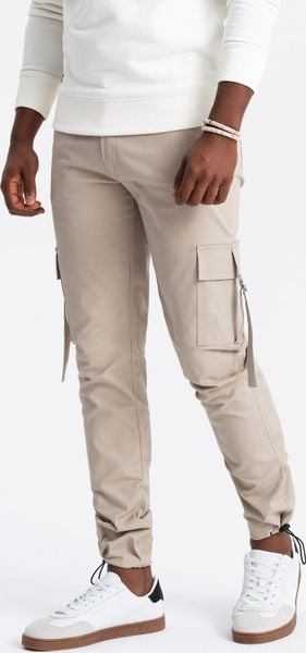 Ombre Męskie spodnie cargo STRAIGHT LEG z paskami na kieszeniach piaskowe V2 OM-PACG-0197 S