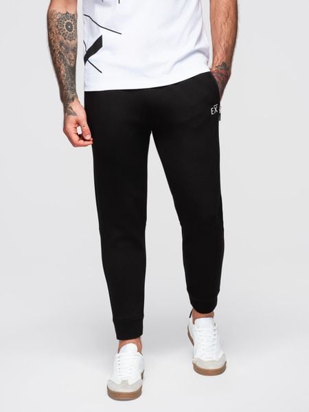 Spodnie dresowe męskie ze ściągaczami w nogawkach i gumowym nadrukiem – czarne V1 – Rozmiar: L