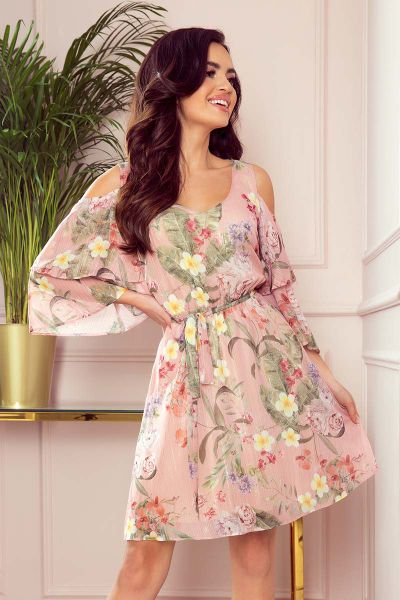 Różowa Szyfonowa Sukienka w Kwiaty z Szerokim Rękawem