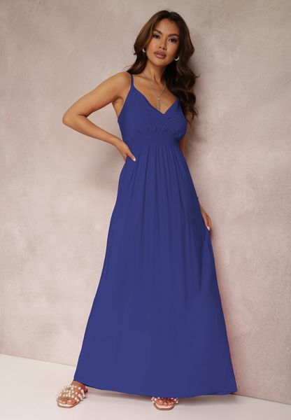 Sukienka Sterinig z gumką w talii i ściągaczem na plecach. Na cienkich, regulowanych ramiączkach. Z kopertowym, głębokim dekoltem. Długość maxi. Wykonana z bawełny. Sprawdzi się podczas upalnej pogody z klapkami.