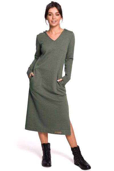 Khaki Długa Prosta Sukienka Dzianinowa z Kapturem