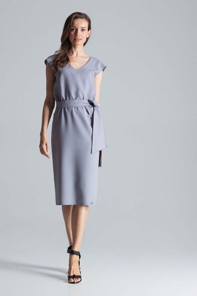 Szara Prosta Midi Sukienka z Dekoltem V z Paskiem