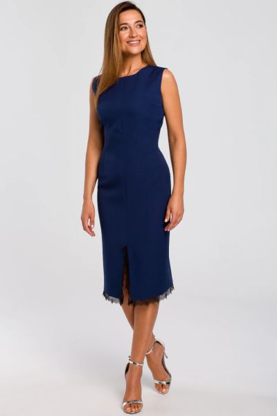Elegancka sukienka ołówkowa midi rozcięcie na dole i koronka granatowa