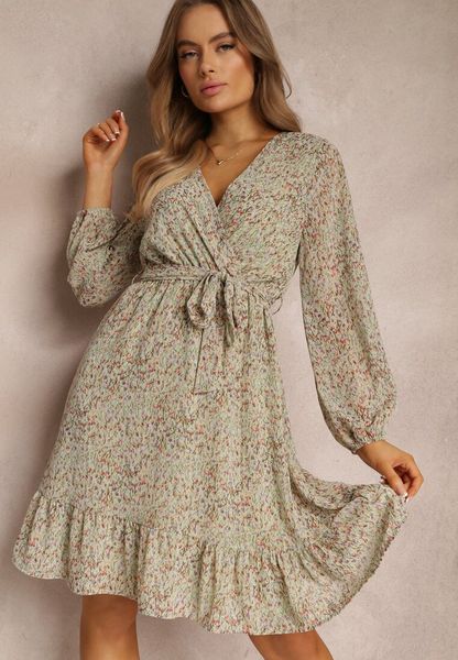 Sukienka Olaleia mini, ozdobiona w całości wzorzystym printem. Dół zakończony zwiewną falbanką, dodającą całości uroku. Z efektownym, kopertowym dekoltem w kształcie litery V. Długi rękaw zakończony ściągaczem. W pasie gumka podkreślająca wcięcie w talii. Pod spodem podszewka z tkaniny. Sukienka Olaleia zaprezentuje się zjawiskowo w towarzystwie wysokich obcasów lub klasycznych balerinek!