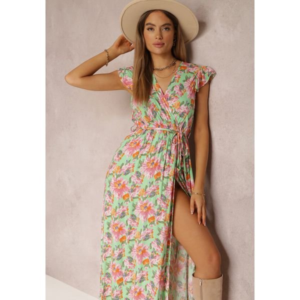 Jasnozielona Sukienka Kopertowa z Gumką w Pasie w Kwiaty Toma