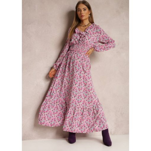 Fuksjowa Sukienka Maxi z Gumką w Pasie i Falbankami oraz Ażurową Tasiemką Juliene