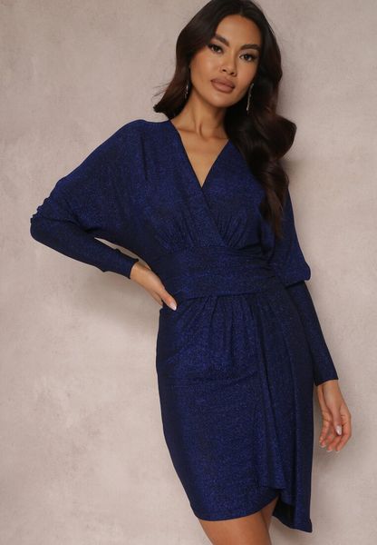 Granatowa Kopertowa Sukienka z Błyszczącą Nicią i Marszczeniem Dalke