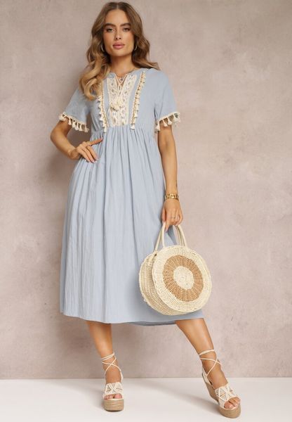 Niebieska Rozkloszowana Sukienka Midi z Gumką w Talii i Ozdobnym Dekoltem Shotomi