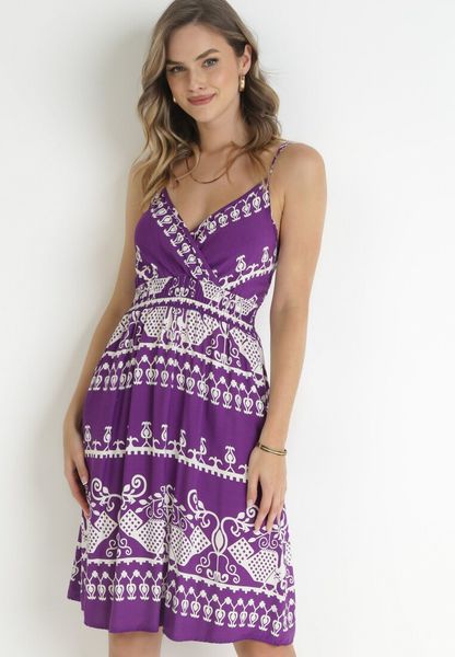 Ciemnofioletowa Sukienka z Wiskozy w Ornamentalny Wzór z Gumką w Talii Hirata