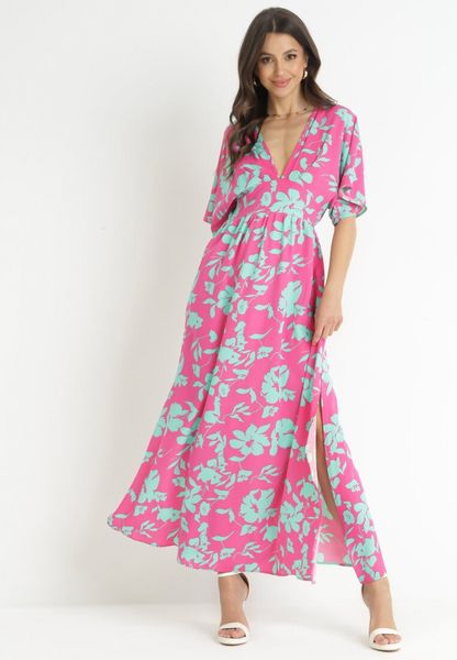 Różowo-Zielona Sukienka Maxi z Rękawem Typu Nietoperz Alexania