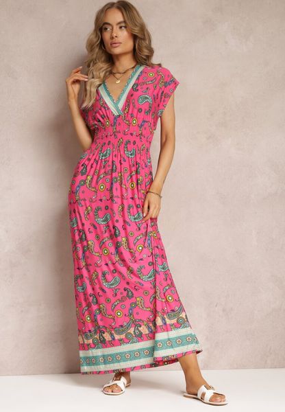 Różowa Rozkloszowana Sukienka Maxi z Printem Paisley z Gumką w Pasie Zoenia