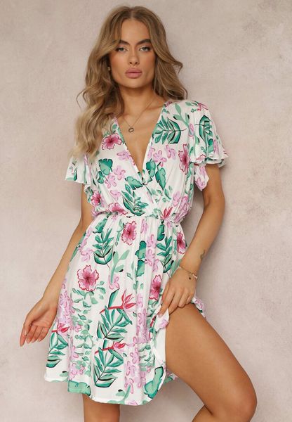 Biała Wiskozowa Sukienka Mini z Gumką w Talii i Kopertowym Dekoltem w Kwiaty Eleagnecca