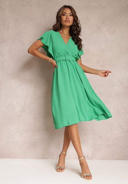 Zielona Rozkloszowana Sukienka z Kopertowym Dekoltem i Wiązanym Paskiem Brynis