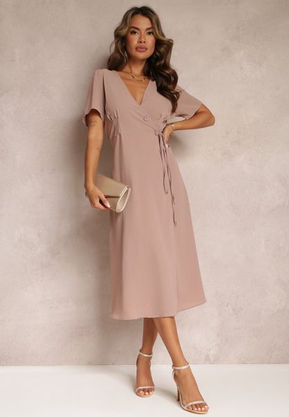 Ciemnobeżowa Sukienka Midi z Kopertowym Dekoltem i Wiązaniem w Pasie Elisanu