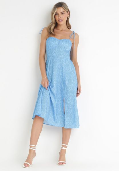 Niebieska Sukienka Midi w Kropki na Ramiączkach Ionttis