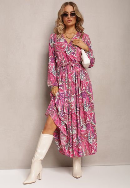Ciemnoróżowa Plisowana Sukienka z Kopertowym Dekoltem i Wzorem Paisley Olanetta