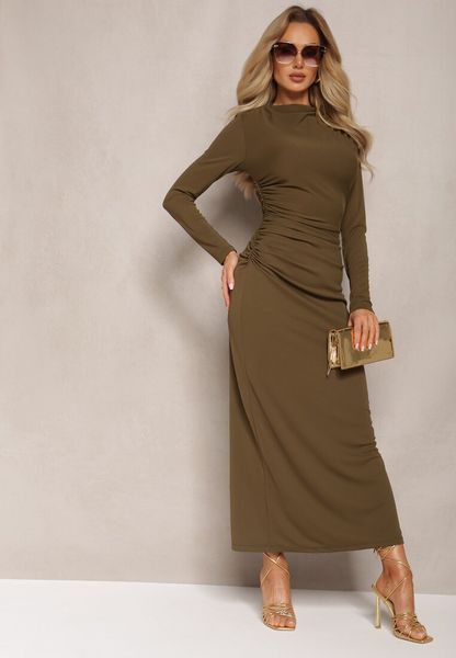 Ciemnozielona Sukienka o Dopasowanym Fasonie z Marszczeniem i Rozcięciem Galariel