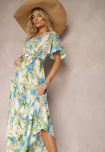 Biało-Zielona Sukienka na Lato Maxi w Kwiaty z Gumką i Wiązanym Paskiem w Talii Uveilla