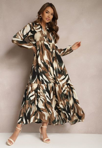 Beżowo-Brązowa Sukienka Rozkloszowana w Abstrakcyjny Print z Koszulową Górą Analow