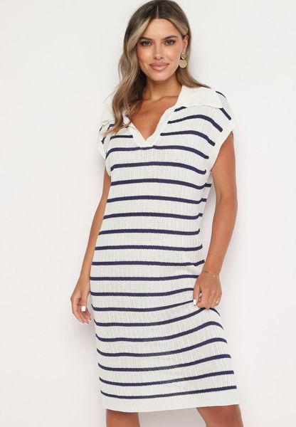 Biało-Granatowa Swterkowa Sukienka o Pudełkowym Kroju z Kołnierzem i Krótkim Rękawem Memorea