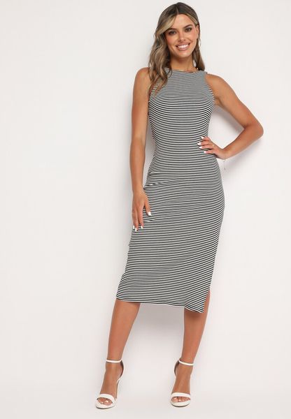 Czarno-Biała Prążkowana Dopasowana Sukienka z Bawełny na Ramiączkach z Ozdobnym Rozcięciem Vimastis