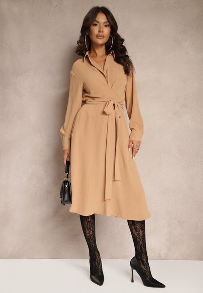 Ciemnobeżowa Sukienka Midi z Kołnierzykiem i Materiałowym Paskiem Rasik