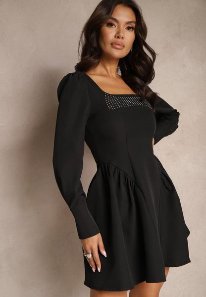 Czarna Krótka Sukienka z Kwadratowym Dekoltem o Rozkloszowanym Fasonie Enadis