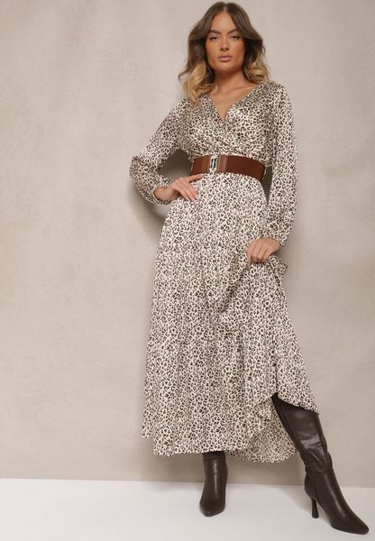 Brązowa Kopertowa Sukienka w Panterkę o Rozkloszowanym Kroju Ozdobiona Paskiem z Klamrą Rinalia