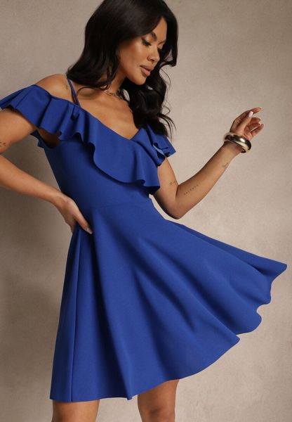 Niebieska Rozkloszowana Sukienka na Ramiączkach z Falbankami Milauri