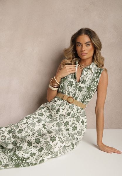 Zielona Bawełniana Sukienka o Koszulowym Kroju Bez Rękawów z Paskiem Mirulenia