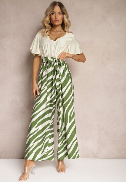 Zielono-Beżowy Taliowany Kombinezon z Szerokimi Nogawkami i Paskiem w Talii Nellma
