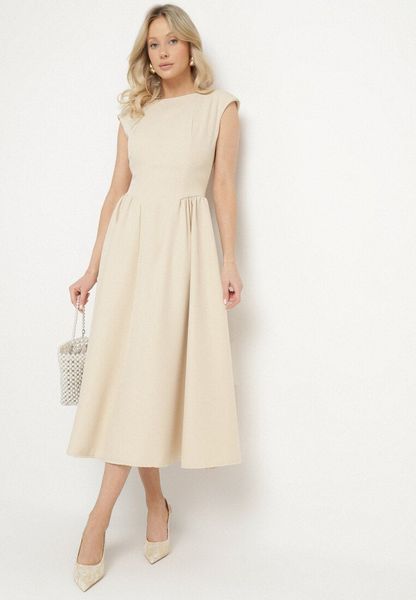 Beżowa Sukienka Vices o Rozkloszowanym Kroju z Dekoltem w Kształcie Łódki Milioria