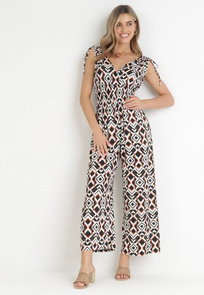 Brązowy Wzorzysty Kombinezon z Kopertowym Dekoltem i Gumką w Pasie z Wiskozy Kathla