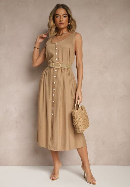 Ciemnobeżowa Rozkloszowana Sukienka z Wiskozy Ozdobiona Guzikami Nataviela