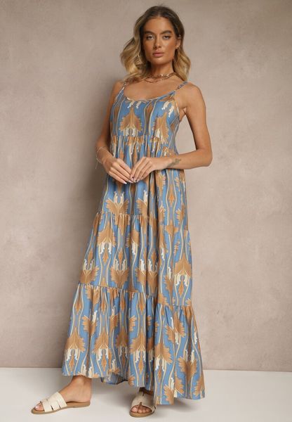 Niebiesko-Beżowa Sukienka w Stylu Boho z Cienkimi Regulowanymi Ramiączkami Tosena