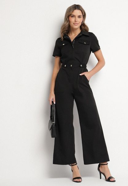 Czarny Kombinezon na Krótki Rękaw z Kołnierzykiem i Szeroką Nogawką Jenanisela