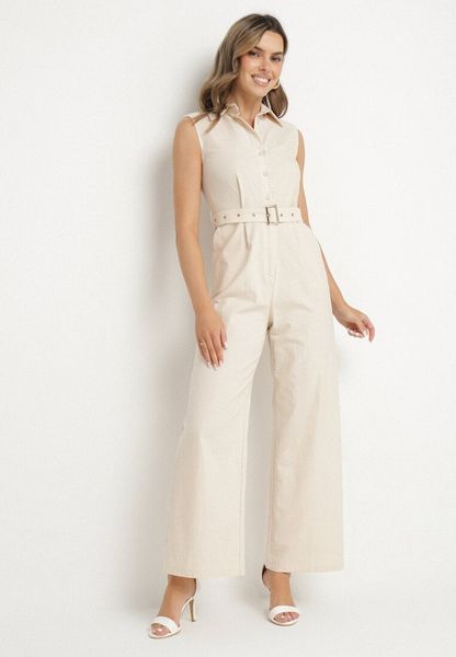 Jasnobeżowy Kombinezon z Lnem i Wiskozą z Koszulową Górą i Materiałowym Paskiem z Klamrą Lolefia