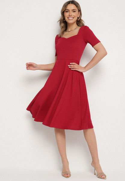 Bordowa Pudełkowa Sukienka z Rozkloszowanym Dołem i Bufiastymi Rękawami Kaimana
