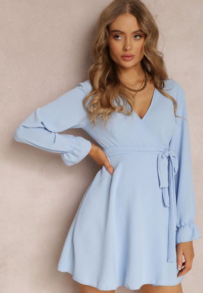 Sukienka Parthameia z lekko rozkloszowanym dołem i efektownym wiązaniem w talii. O długości mini i kopertowym fasonie. Dekolt w trójkątnym kształcie. Wykonana z tkaniny utrzymanej w jednolitej kolorystyce. Z długim, lekko bufiastym rękawem. Bez podszewki. Czarująco prezentuje się w towarzystwie wiązanych sandałków na obcasie lub klasycznych balerinek.