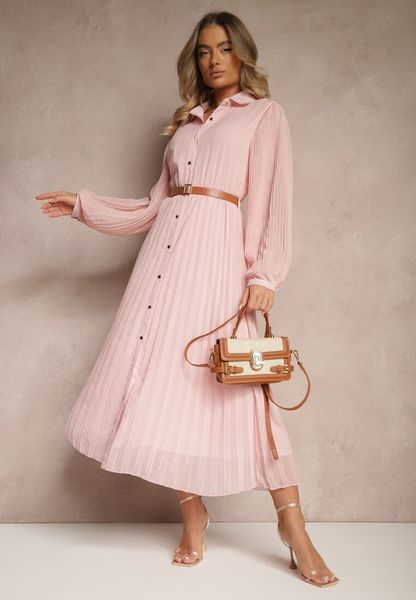 Różowa Koszulowa Sukienka z Plisami i Dodatkowym Paskiem Miarosea