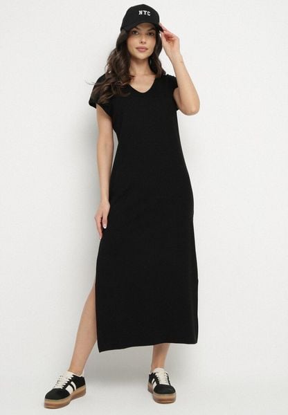 Czarna Bawełniana Sukienka Pudełkowa z Trójkątnym Dekoltem z Rozcięciem Natrisenia