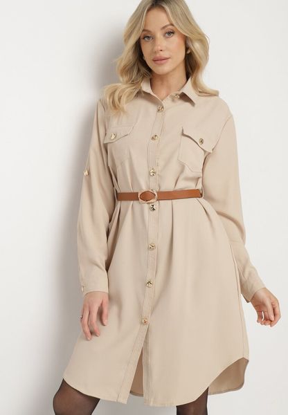 Beżowa Sukienka Koszulowa z Regulowanymi Rękawami i Paskiem w Talii Esarivia