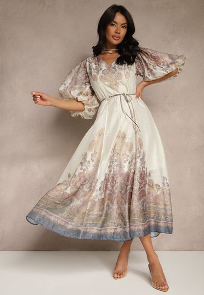 Jasnobeżowa Rozkloszowana Sukienka z Wiskozy z Wiązaniem i Ornamentalnym Wzorem Redanira