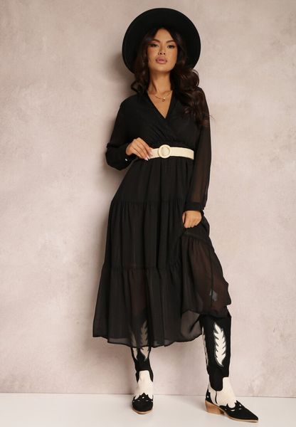 Czarna Sukienka z Kopertowym Dekoltem i Plecionym Paskiem Velo