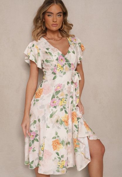 Beżowa Kopertowa Sukienka w Kwiaty Atesalia