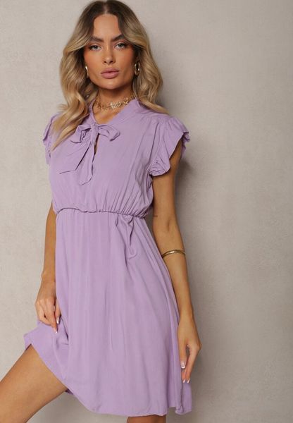 Jasnofioletowa Sukienka z Rozkloszowanymi Rękawami Gumką w Pasie i Wiązaniem na Plecach Larielle