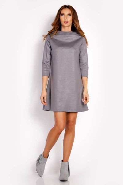 Szara Sukienka Trapezowa z Woskowanej Tkaniny z Kołnierzem