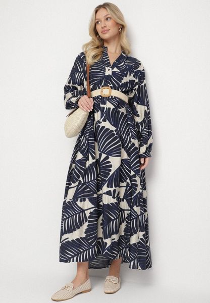 Niebieska Wiskozowa Sukienka o Rozkloszowanym Kroju w Liście Rivvesa