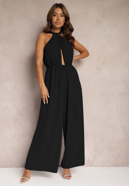 Czarny Taliowany Kombinezon ze Ściągaczem w Talii i Wiązaniem przy Szyi Rivasiris